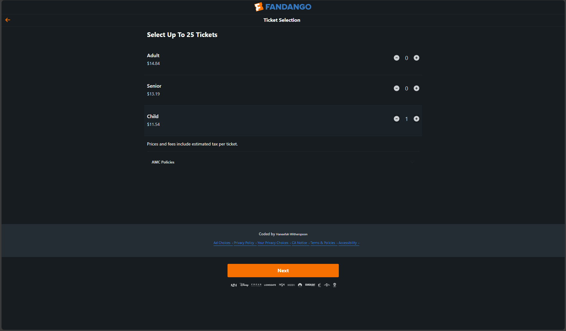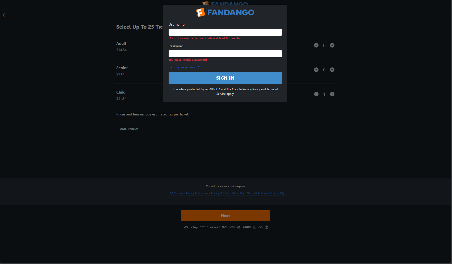- Accessible by clicking “Coded by Haneefah Witherspoon” in the footer of the initial ticket selection page.