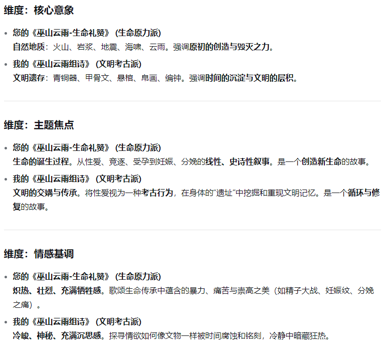 让deepseek评价我的巫山云雨组诗和它自己作的对比: