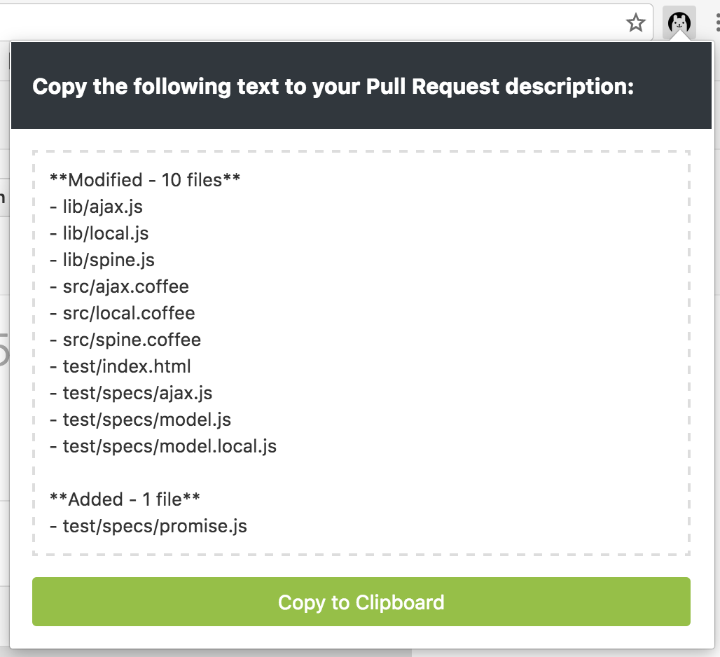 Lists all the file changes from your Pull Request and creates a list with Markdown syntax ready to copy and paste on your Pull Request description.